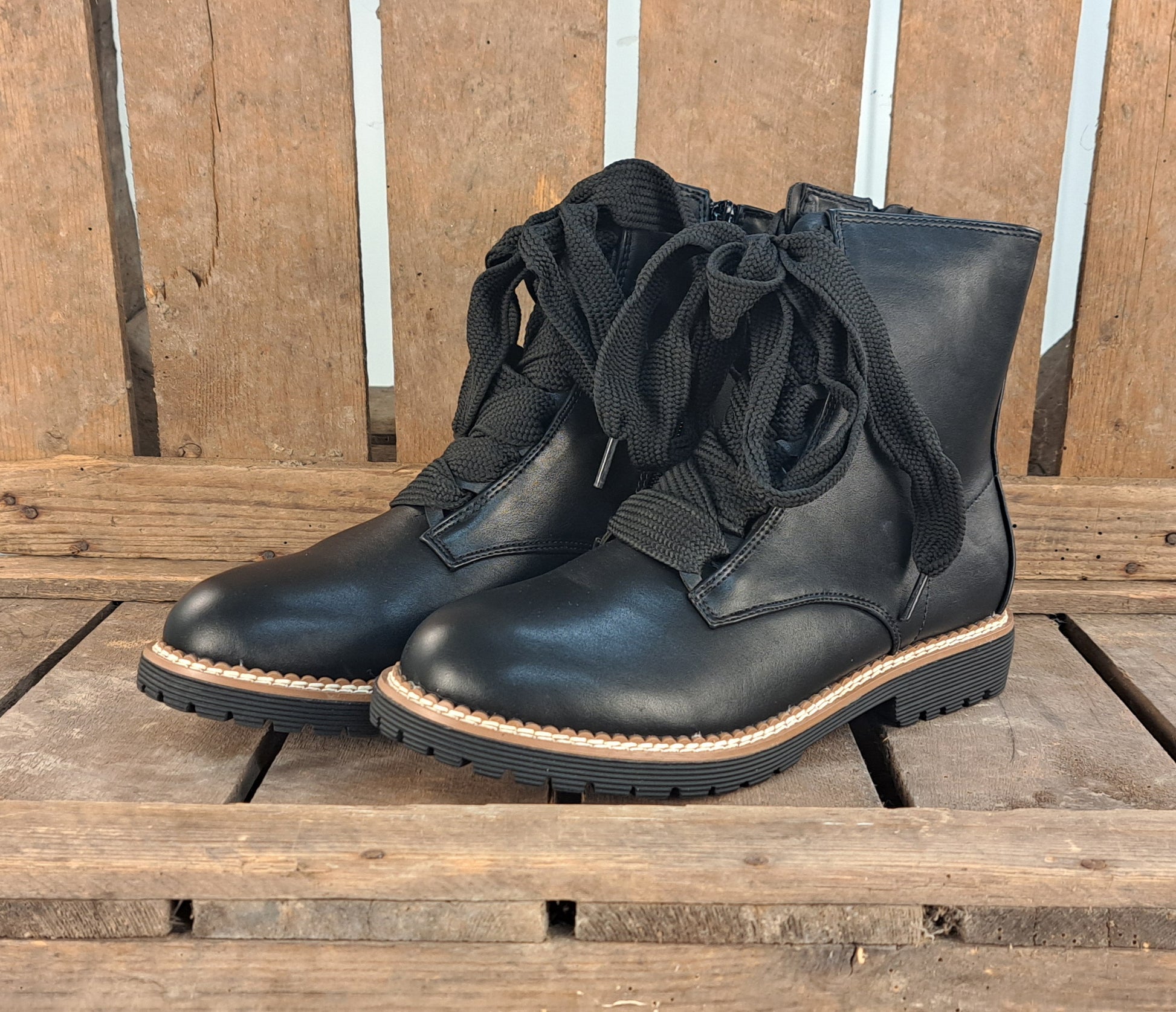 Deze tijdloze laarsjes hebben extra brede veters wat ze tot een echte eye catcher maakt. Makkelijke in en uitstap, door de ritssluiting aan de zijkant.