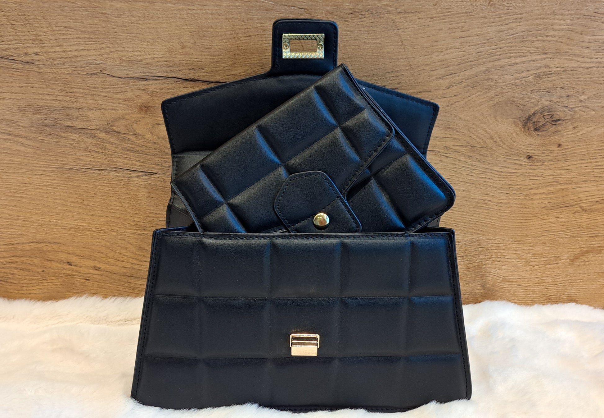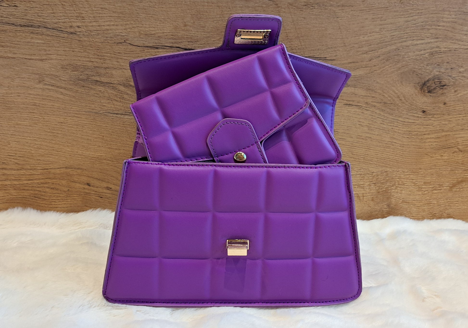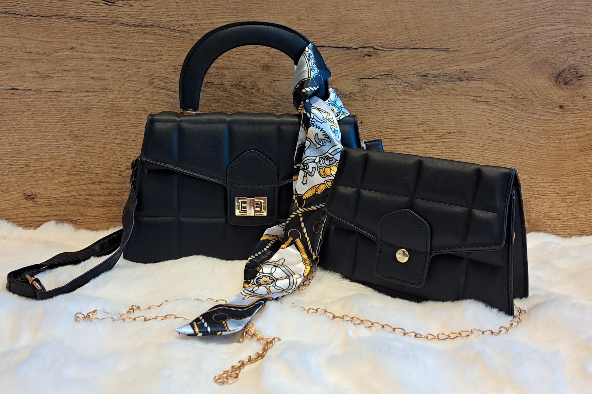 Wat een chique duo is dit! Deze Two Day tassenset is maar liefst in vijf trendy kleuren verkrijgbaar. De grotere tas, met het stevige handvat en de draaisluiting, is ideaal voor een elegante look. De kleinere tas, met de gouden schakelketting, is perfect als crossbody of schoudertas voor een avondje uit of wanneer je alleen je telefoon en pasjes nodig hebt.