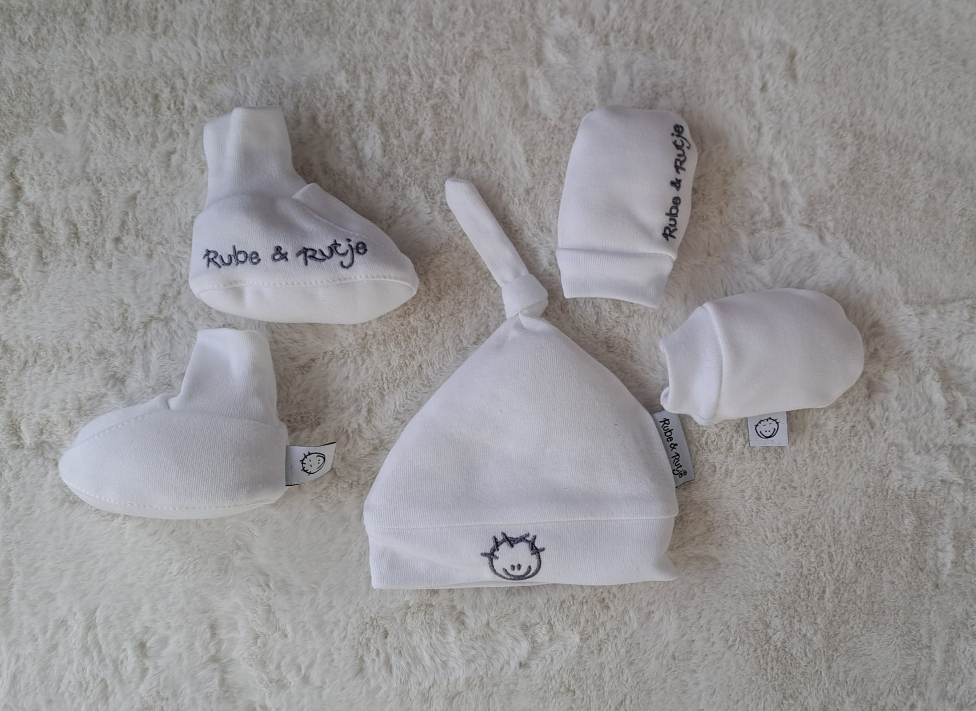 De set is in verschillende kleuren verkrijgbaar, bestaat uit een baby mutsje met Rube aan de ene zijde, en Rutje aan de andere zijde geborduurd. Verder zit er een super schattig setje baby slofjes in deze set. En natuurlijk ook nog fijne (krab)wantjes. Kortom met deze leuke set is je baby helemaal voorzien en verwend! Ook natuurlijk leuk om te geven b.v. als kraam cadeau